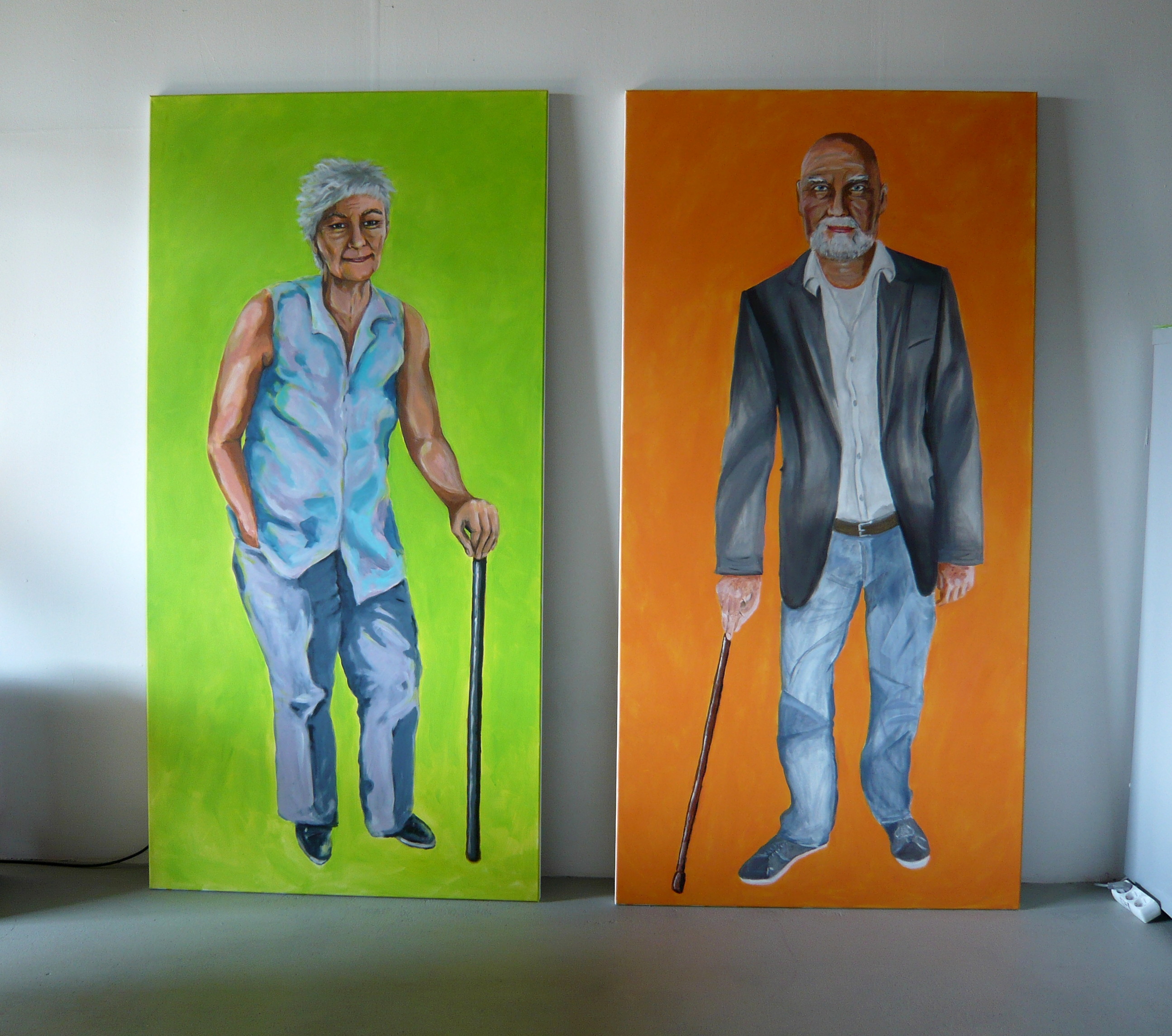 Dazu gehörten auch diese Selbstportraits in Lebensgröße, auf denen sich jeder von uns dreißig Jahre älter gemalt hat (je 2 m X 1 m, Acryl auf Leinwand):