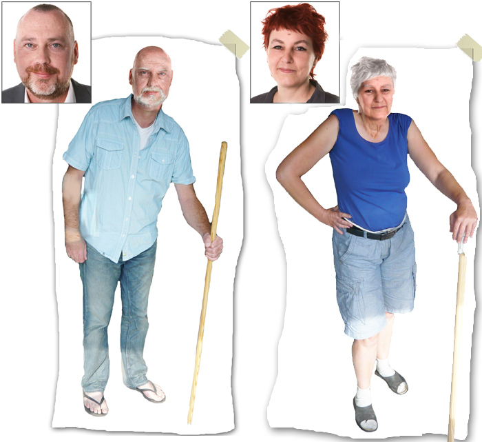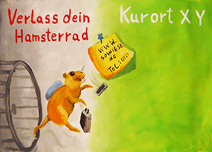 Anders der Typ „Unzufriedener“. Krankheit ist für ihn sein fremdbestimmter Alltag im Hamsterrad, in dem er sich so gefangen fühlt, dass ihm als gesunde Alternative zu seinem Leben auf dem Werbeplakat nur die Idee eines diffusen „grün“ einfiel. Künstlerisch ins Extreme gezogen, bleibt eine schäbig grau-braune, triste Hamsterrad-Tapete. Das Motiv des „Hamsterades“ wurde aus dem Rohmaterial übernommen und durch Verrücken in den Kontext eines sich ständig wiederholenden Tapetenmusters künstlerisch verfremdet.