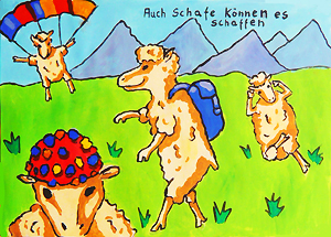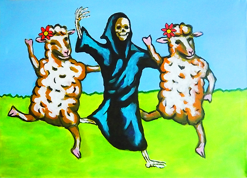 Die depressivsten unter den Typen, die „Ausgebrannten“, die in ihrem Alltag völlig überlastet sind, Erfahrungen mit schweren Krankheiten und Tod zu ihrem täglichen Leben gehören, erwiesen sich erstaunlicher Weise als die Humorvollsten. Galgenhumor, der bleibt, wenn man sich bereits wie ein dummes wehrloses Schaf mit seinem Schicksal abgefunden hat, „Zumba“-Tanzen mit Gevatter Tod. Der comic-artige Stil und die Schafe sind aus dem Werbeplakat übernommen worden und künstlerisch mit Hinzufügen des Todes neu arrangiert worden.