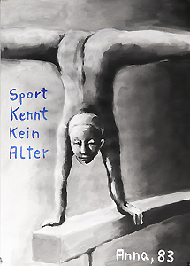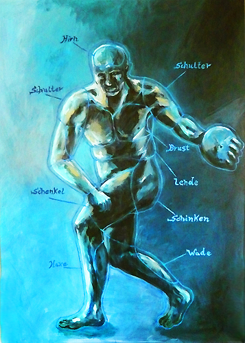 Eine Gruppe, die von uns „Selbstoptimierer“ getauft wurde, unterstellte sich dem Kulturdiktat. Sie trieben Leistungssport, ernährten sich z.T. von speziellen Eiweispräparaten und setzen alles dran, den eigenen Verfallsprozess aufzuhalten, was ihre extreme Angst vor dem Altern offenbarte. Das von ihnen gestaltete Werbeplakat zeigt einen Körperkult, der an die Olympia-Fotos von Leni Riefenstahl erinnert. Ein Foto von ihr diente daher als Vorlage für das Gemälde. Man selbst als Selbstoptimierer sieht sich als Konglomerat von Muskelpartien, deren fleischliche Qualität es stetig zu verbessern gilt, Filet statt Bauchspeck.