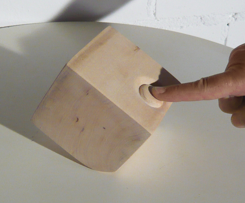 Der Kippklotz. Man bewegt etwas, wirkt ein, indem man auf den Knopf drückt, verändert aber gar nichts. Sobald man los lässt, kippt der Klotz in seine Ausgangslage zurück. Ein Smartphone macht mit seinen vielen Tasten und unzähligen Apps Glauben, man würde mit seiner Bedienung wichtige und manigfaltige Funktionen anstoßen. Geschnitzt in Holz und reduziert auf einen Scheinknopf deckt der Kippklotz auf, dass man eigentlich gar nichts bewirkt, auch wenn einem der eigene Tastsinn das Gefühl gibt, etwas zu bewegen.