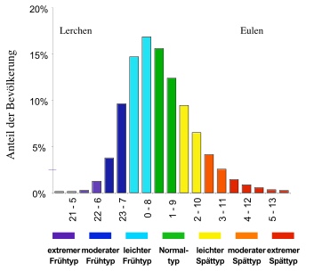 Dabei hat der Chronotypus – so das Fachwort für den unterschiedlichen Schlaf-Wach-Rhythmus – vermutlich genetische Ursachen und ist nur schwer zu ändern. Er ändert sich mit dem Alter, wie das Beispiel der Kinder und Jugendlichen zeigt, und bei Erwachsenen gibt es individuelle Unterschiede, die sich in etwa normalverteilen, wie die Häufigkeitsverteilung der Chronotypen in der Bevölkerung zeigt (Quelle: Wikipedia / LMU Institut für Medizinische Psychologie, Zentrum für Chronobiologie):