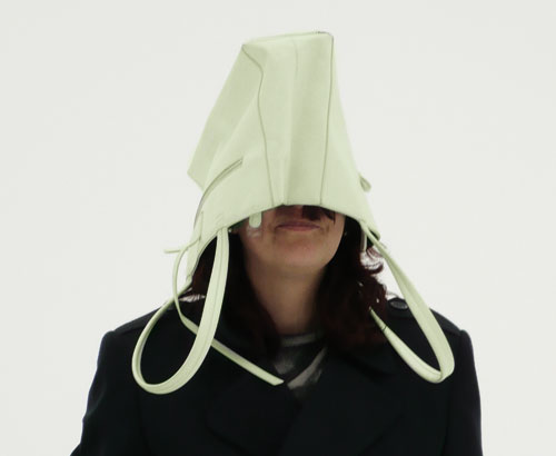 Kipplig und fragil sind die Skulpturen außerdem, sowohl wenn man sie betrachtet aber mehr noch, wenn man sich (nach berechtigter Überwindung, s.o.) plötzlich selbst als Teil der Skulptur wieder findet. Eine ‚one minute sculpture’ eben. Und das gar nicht mal wegen der komischen Körperhaltung, die man nicht lange aushält – mit der Tasche auf dem Kopf sieht man schließlich nichts, auch der Stift rutscht einem irgendwann aus dem Nasenloch – sondern eher wegen des Eindrucks, den man auf andere macht. Da wären wir wieder bei der Lächerlichkeit.